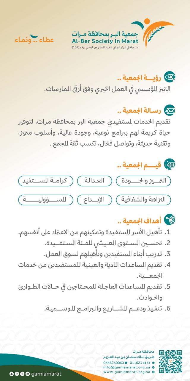 جمعية البر بمحافظة مرات: منظمة أهلية غير هادفة للربح مرخصة من المركز الوطني لتنمية القطاع غير الربحي برقم 107, تأسست بتاريخ 21/9/1412هـ وإنشئت من أجل تحقيق أغراض البر, وتقدم خدمات دعم الدخل, وتستهدف ذوي الدخل المنخفض.